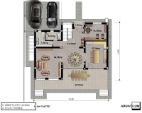Parterul este compus din living, locul de luat masa, bucătăria și un birou, iar toate acestea comunică vizual pentru că tot parterul este “open space”. Funcțiunile anexe cum ar fi baia, camera tehnică și debaraua sunt poziționate separat și bine gândit pentru a prelua pe patea de instalații băile de la etaj. Livingul are ca punct de interes suprafața vitrată către lacul Pantelimon, iar pe întraga fațadă avem o terasă mare pentru o bună utilizare a zonei din spate.