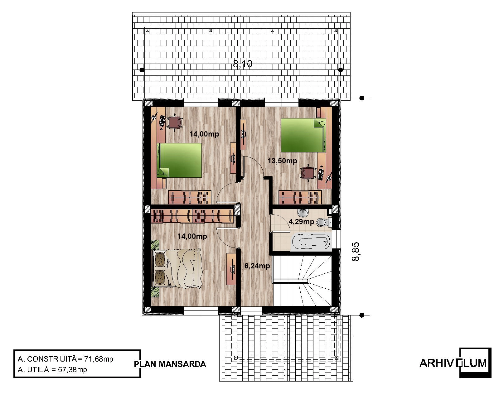 Etajul mansardat este compus din 3 dormitoare bine dimensionate cu o baie comună. Casa cu 3 dormitoare are o suprafață utilă de 122,00mp. Casa unifamilială cu o suprafață utilă interioară de de 122 mp, este soluția perfectă pentru o familie cu 4 membrii sau poate fi și o casă de vacanță foarte elegantă.